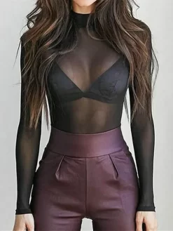 Women Mesh T-shirt Long Sleeve Mock Neck Slim Fit Tops Beach Club Sexy See Through Shirts Cover-ups Female Streetwear
